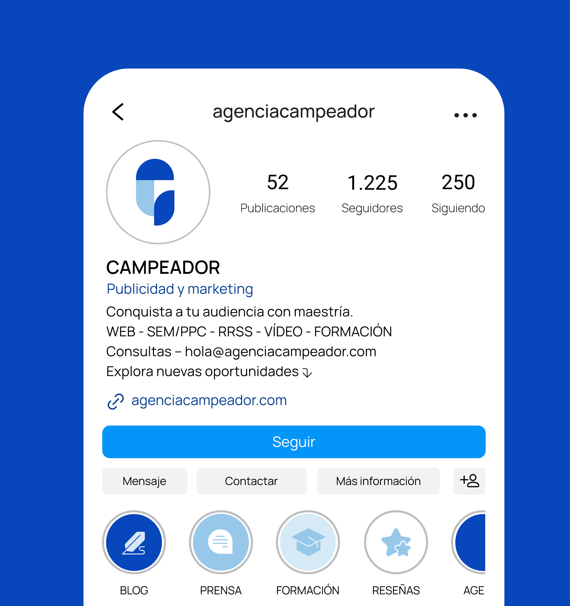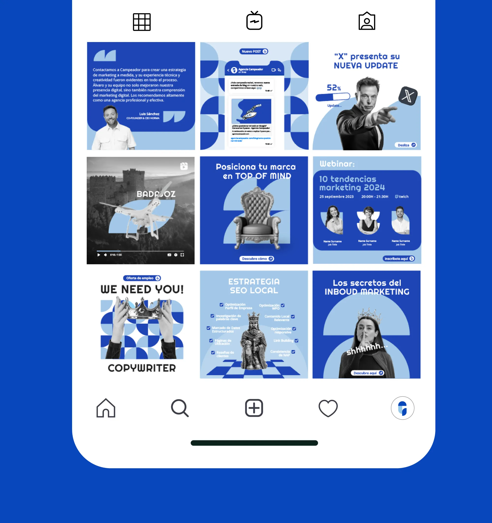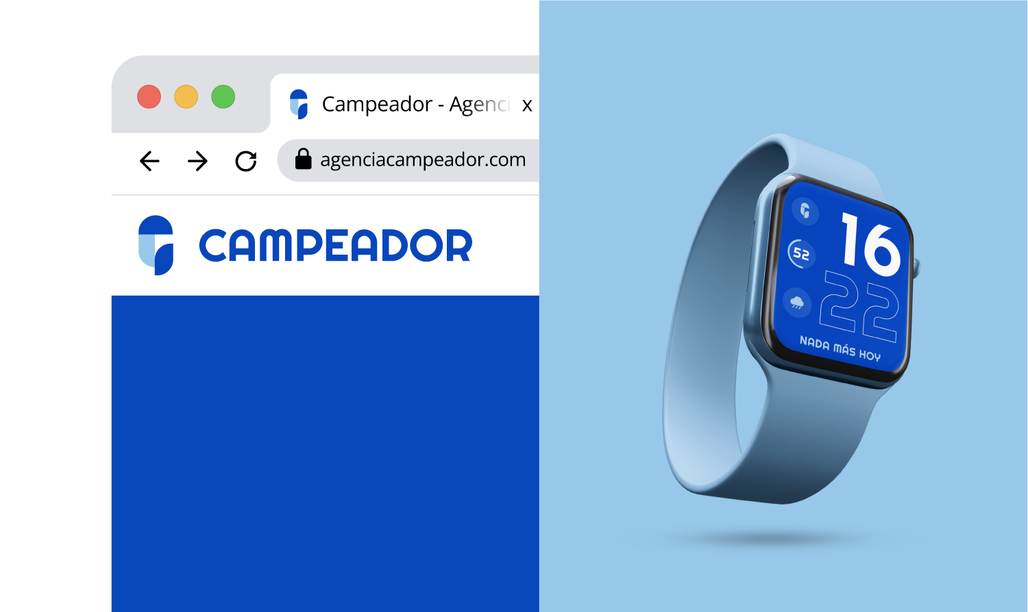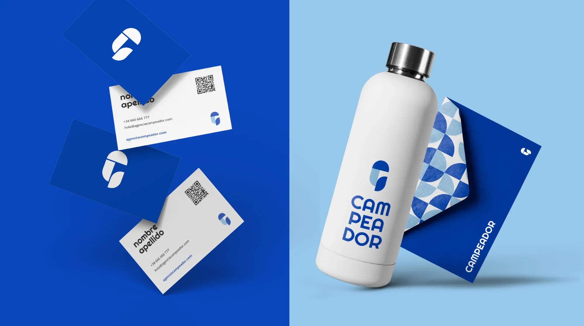 La paleta cromática de Campeador se basa en una gama de azules que transmite confianza y credibilidad, reforzando el posicionamiento de la marca como agencia de comunicación.