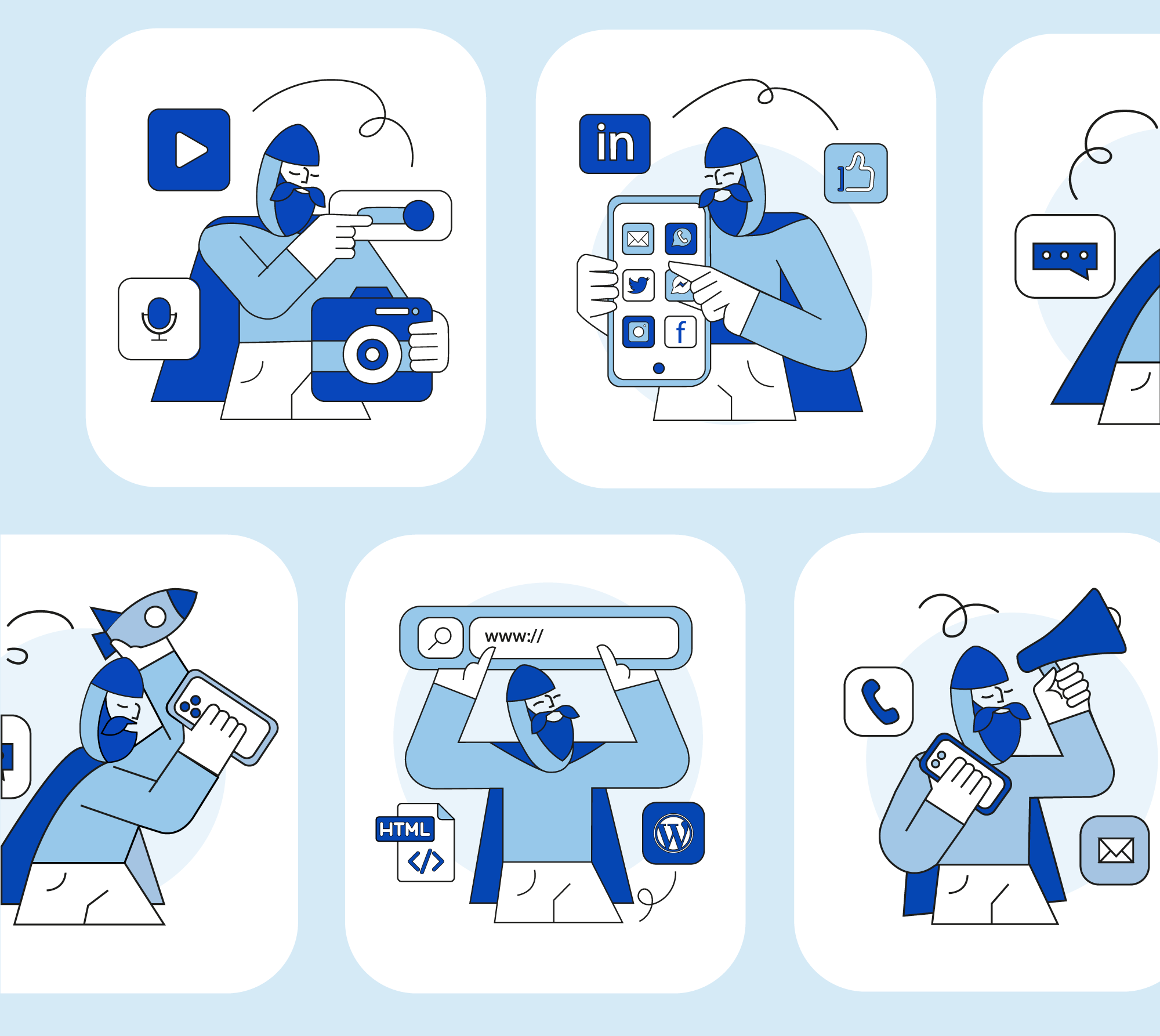 Se desarrolló un sistema visual propio que integra ilustraciones, iconografía y recursos gráficos alineados con la estrategia de comunicación de la marca.