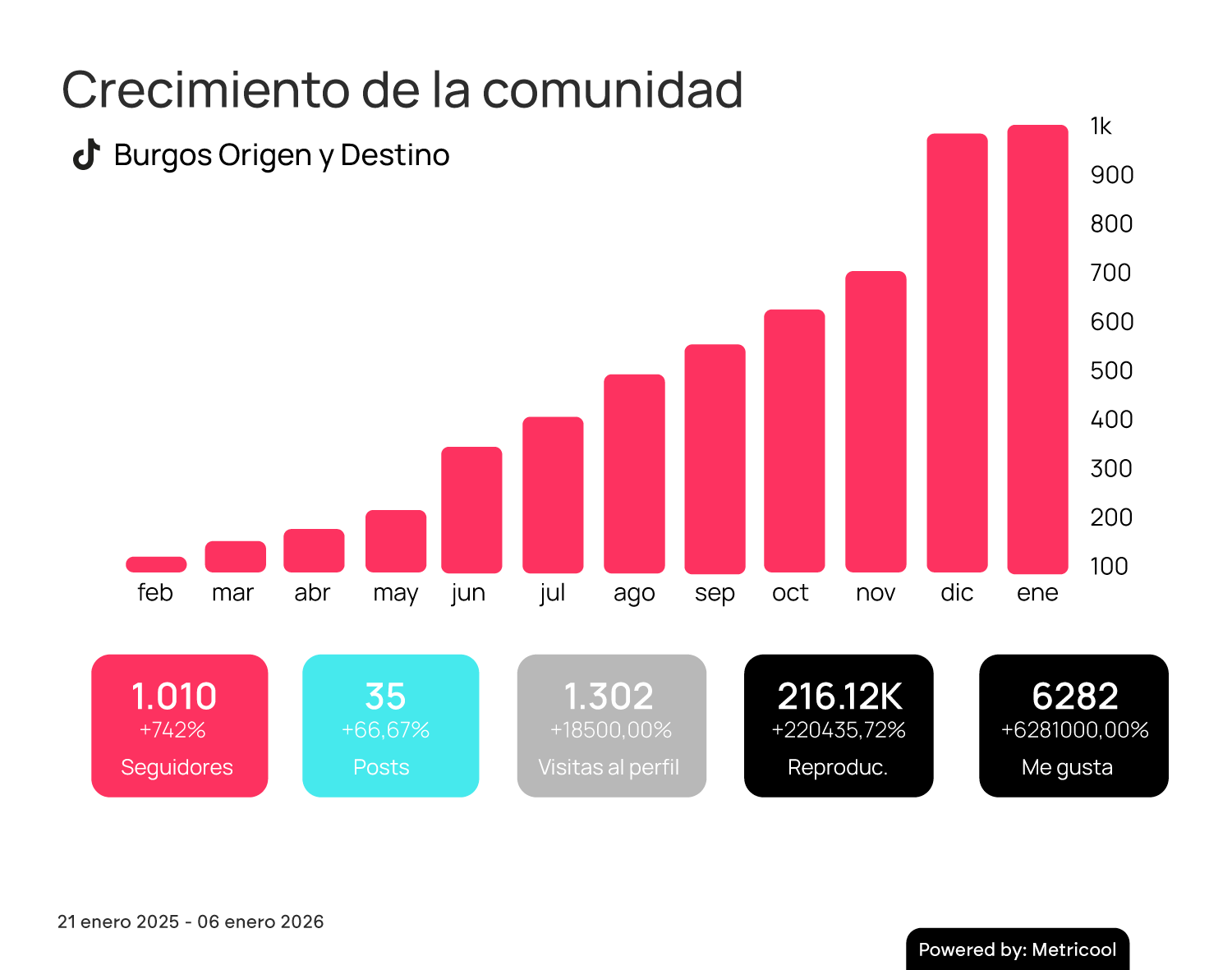 TikTok, que a principios de enero tenía una de media 90 reproducciones por video, mostró un crecimiento muy destacado, pasando de 120 a 1.011 seguidores (+742 %).